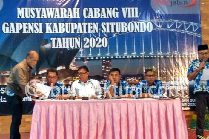 BUMIAKTUAL, SITUBONDO – Gabungan Pelaksana Konstruksi Indonesia (Gapensi) melaksanakan Musyawarah Cabang (Muscab) ke VIII di Hotel Sansui Situbondo, Rabu (08/01/2020). Dalam acara tersebut Kamarul Muniri secara aklamasi terpilih sebagai Ketua Gapensi periode 2020-2025.