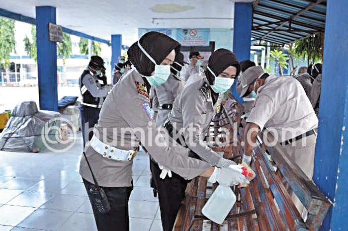 Tak hanya di terminal, seluruh anggota jajaran petugas kepolisian serentak juga membersihkan beberapa fasilitas umum. Seperti kantor pelayanan SKCK, Samsat. Mereka menggunakan peralatan lengkap. Para petugas gabungan menyemprot disinfektan di sejumlah ruangan. Karena dengan cairan itulah virus bisa mati.
