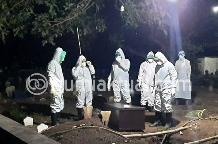 BUMIAKTUAL,SITUBONDO – Petugas Kepolisian Situbondo membantu proses pemakaman jenazah warga bernama Sukandar (67), warga Lingkungan Bukit Putih, Kecamatan Panji, Senin malam (27/04/2020). Proses pemakamanpun berbeda dari biasanya. Sebab, petugas menggunakan pakaian khusus, standar kesehatan Covid-19.