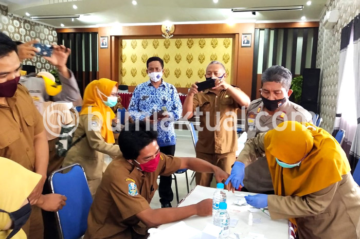 BUMIAKTUAL, SITUBONDO – Hasil rapid tes kepada 18 tenaga pengajar di Sekolah Menengah Kejuruan Negeri (SMKN) 1 Panji menunjukkan hasil reaktif. Kepala Cabang Dinas Pendidikan Jawa Timur Wilayah Situbondo Bondowoso, Sugiono Eksantoso menjelaskan, pengecekan daya tahan tubuh itu dilakukan oleh Puskesmas Panji, setelah menyusul ada kabar duka, kematian Bupati Situbondo, Dadang Wigiarto akibat Covid 19. “Setelah dilakukan rapid tes kepada semua guru, ditemukan ada 18 yang reaktif,” jelas pria yang akrab disapa Sugiono, Selasa (01/12/2020).