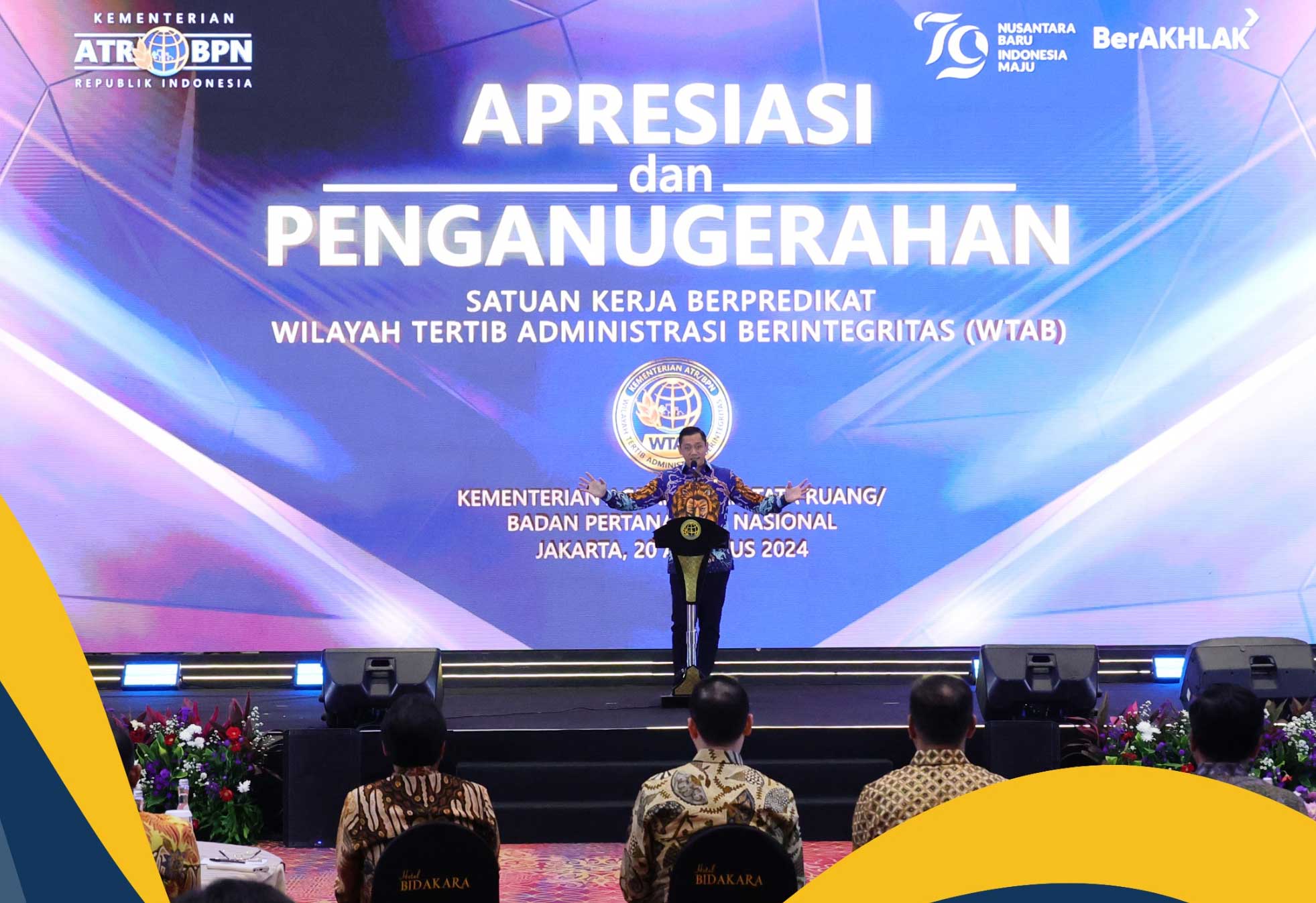 Jakarta – Menteri Agraria dan Tata Ruang/Kepala Badan Pertanahan Nasional (ATR/BPN), Agus Harimurti Yudhoyono (AHY) memberikan predikat Wilayah Tertib Administrasi Berintegritas (WTAB) kepada 46 satuan kerja daerah, di Birawa Assembly Hall, Bidakara Hotel, Jakarta, Selasa (20/08/2024). Predikat WTAB ini diberikan dalam rangka mendukung penuh upaya pembangunan Zona Integritas Sistematis Lengkap Berkelanjutan di lingkungan Kementerian ATR/BPN.