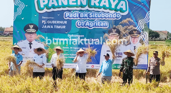 BUMIAKTUAL, SITUBONDO – Pj Gubernur Jawa Timur, Adhy Karyono menghadiri acara panen Padi BK Situbondo 01 Agritan di Desa Demung, Kecamatan Besuki, Kabupaten Situbondo, Senin (26/8/2024).