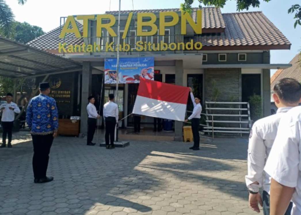 BUMIAKTUAL, SITUBONDO-Badan Pertanahan Nasional (BPN) Kabupaten Situbondo menggelar ucapata bendera dalam rangka memperingati Hari Sumpah Pemuda tahun 2024 di halaman Kantor ATR/BPN Situbondo, Senin (28/10).