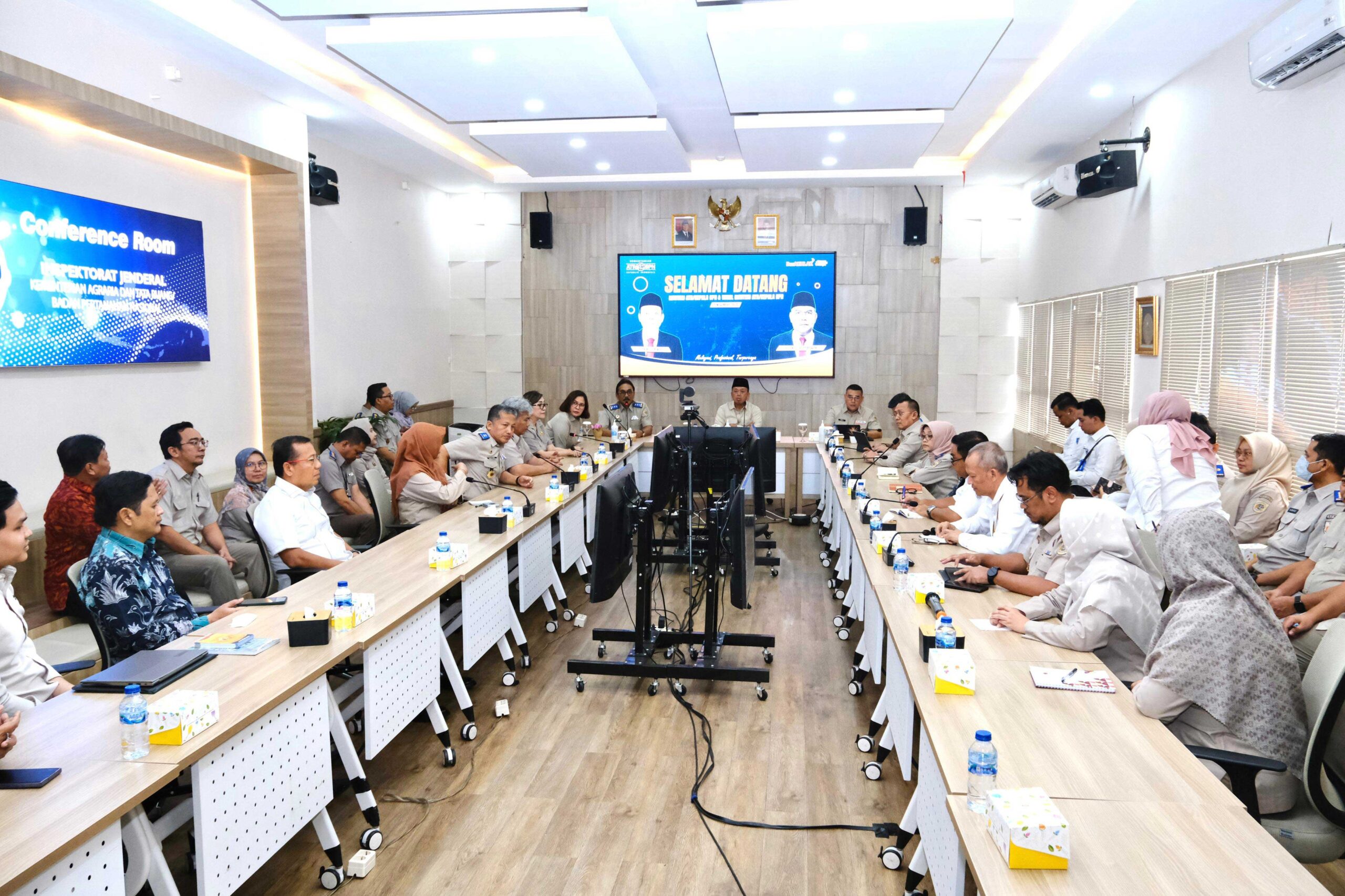 Dalam kunjungan kali ini, Menteri Nusron Wahid dan Wamen Ossy Dermawan bertemu dengan sejumlah Pejabat Pimpinan Tinggi Madya dan Pratama di lingkungan Direktorat Jenderal (Ditjen) Penataan Agraria, Ditjen Pengadaan Tanah dan Pengembangan Pertanahan, Inspektorat Jenderal, serta Badan Bank Tanah. (AR/FA)
