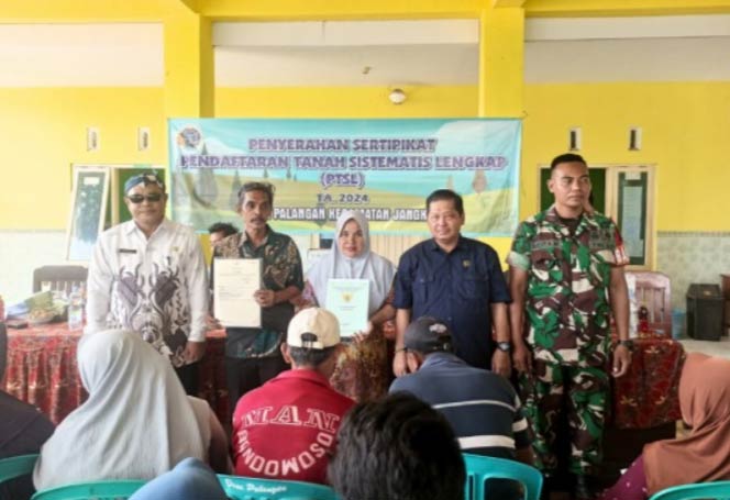 BUMIAKTUAL, SITUBONDO-Badan Pertanahan Nasional (BPN) Kabupaten Situbondo menyerahkan sertipikat PTSL tahun 2024 kepada warga Desa Palangan Kecamatan Jangkar, Kabupaten Situbondo, Kamis (14/11). Kegiatan yang di tempatkan di balai desa tersebut di hadiri oleh warga yang terdaftar dalam program PTSL dan di saksikan langsung oleh seluruh perangkat desa setempat.