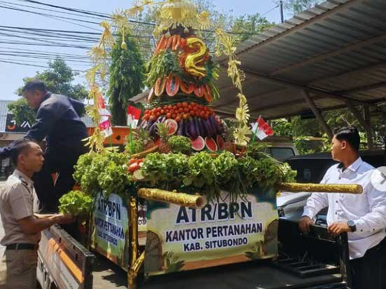 BUMIAKTUAl, SITUBONDO-Kantor Pertanahan Kabupaten Situbondo turut berpartisipasi pada kegiatan Ancak Agung dan Pengajian Umum bersama KHR. Muhammad Kholil As’ad dalam rangka memeriahkan Peringatan Maulid Nabi Muhammad SAW 1447 H/2025 M, Senin (25/8).