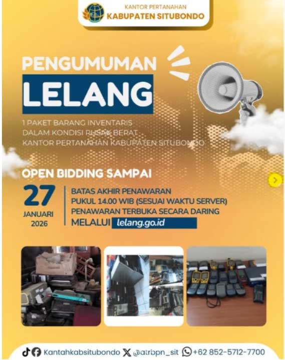 Kantor Pertanahan Kabupaten Situbondo akan melaksanakan Lelang Non Eksekusi Wajib Barang Milik Negara dengan perantara Kantor Pelayanan Kekayaan Negara dan Lelang (KPKNL) Jember, berupa: 1 (satu) Paket Barang Inventaris Kantor berupa Peralatan dan Mesin dari berbagai merk dan jenis sebanyak 236 (dua ratus tiga puluh enam) unit kondisi rusak berat dengan Nilai Limit sebesar Rp 10.173.365 dan Uang jaminan sebesar Rp 5.086.683,-